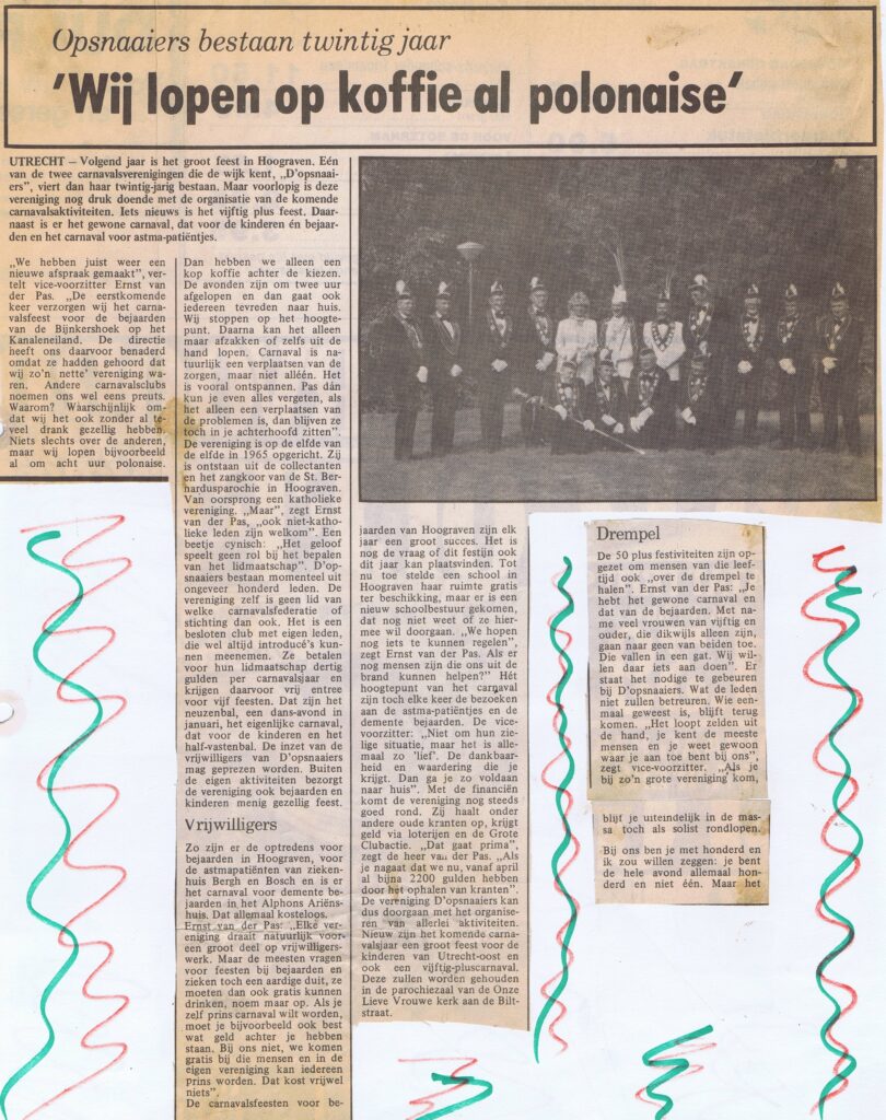 UTRECHT – Volgend jaar is het groot feest in Hoograven. Eén van de twee carnavalsverenigingen die de wijk kent, ‘d’Opsnaaiers’, viert dan haar twintigjarig bestaan. Maar voorlopig is deze vereniging nog druk doende met de organisatie van de komende carnavalsactiviteiten. Iets nieuws is het vijftig-plus feest. Daarnaast is er het gewone carnaval, dat voor de kinderen en bejaarden en het carnaval voor astmapatiëntjes.