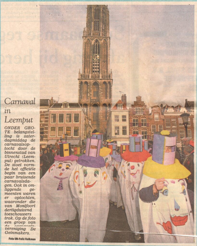 Niet alleen Utrecht doet mee. Ook omliggende gemeenten sluiten aan en brengen hun eigen optochten en publiek mee. Tienduizenden mensen genieten van het spektakel. Op de foto zien we leden van carnavalsvereniging De Geinmakers, herkenbaar aan hun opvallende uitdossingen, midden in het feestgedruis.