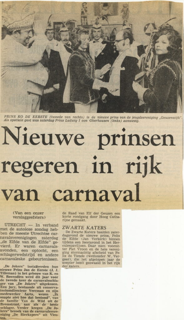 „De Jokers” installeerden hun nieuwe Prins Jan de Eerste (J. J. Tilleman) in het gebouw van K. en W. Bovendien werd dit jaar voor de tweede keer de carnavalschlager van „De Jokers” uitgekozen. Een jury, bestaande uit conservatoriumdirecteur Veerman en zijn medewerker Aarts, wezen „Ik snapte niet hoe dat bestond” van de familie Van de Wild uit de Breestraat aan als de beste schlager. Verder kregen „De Jokers” bezoek van de carnavalsvereniging „De Bierkapers” uit Vleuten.