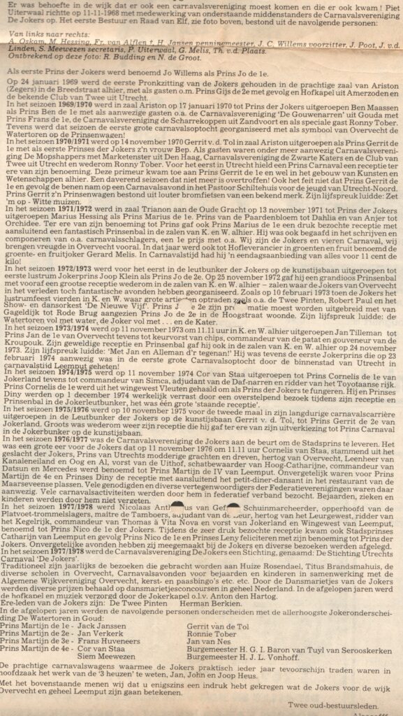 Wat volgde was geen klein verhaal, maar een indrukwekkende reeks seizoenen vol prinsen, pronkzittingen, optochten, muziek en onvergetelijke momenten. Van zalen als Ariston, K & W, Triannon en de Jokerbunker tot grote optochten door Utrecht: De Jokers waren overal.
