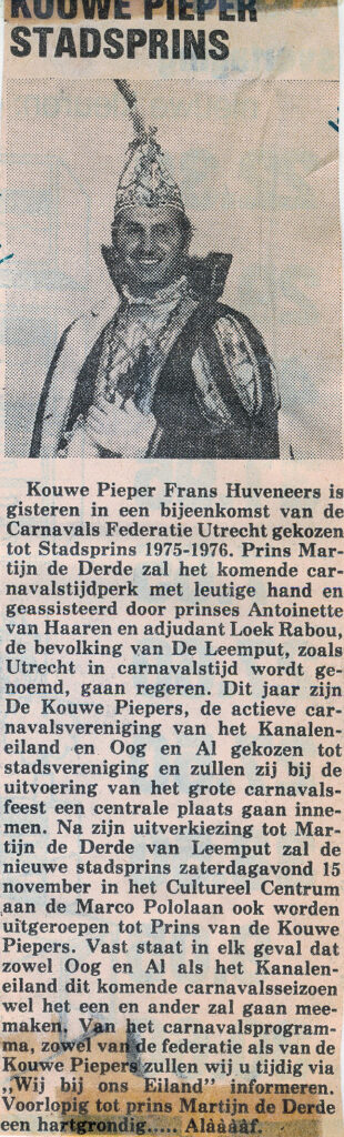 Kouwe Pieper Frans Huveneers is gisteren in een bijeenkomst van de Carnavals Federatie Utrecht gekozen tot Stadsprins 1975-1976. Prins Martijn de Derde zal het komende carnavalstijdperk met leutige hand en geassisteerd door prinses Antoinette van Haaren en adjudant Loek Rabou, de bevolking van De Leemput, zoals Utrecht in carnavalstijd wordt genoemd, gaan regeren.