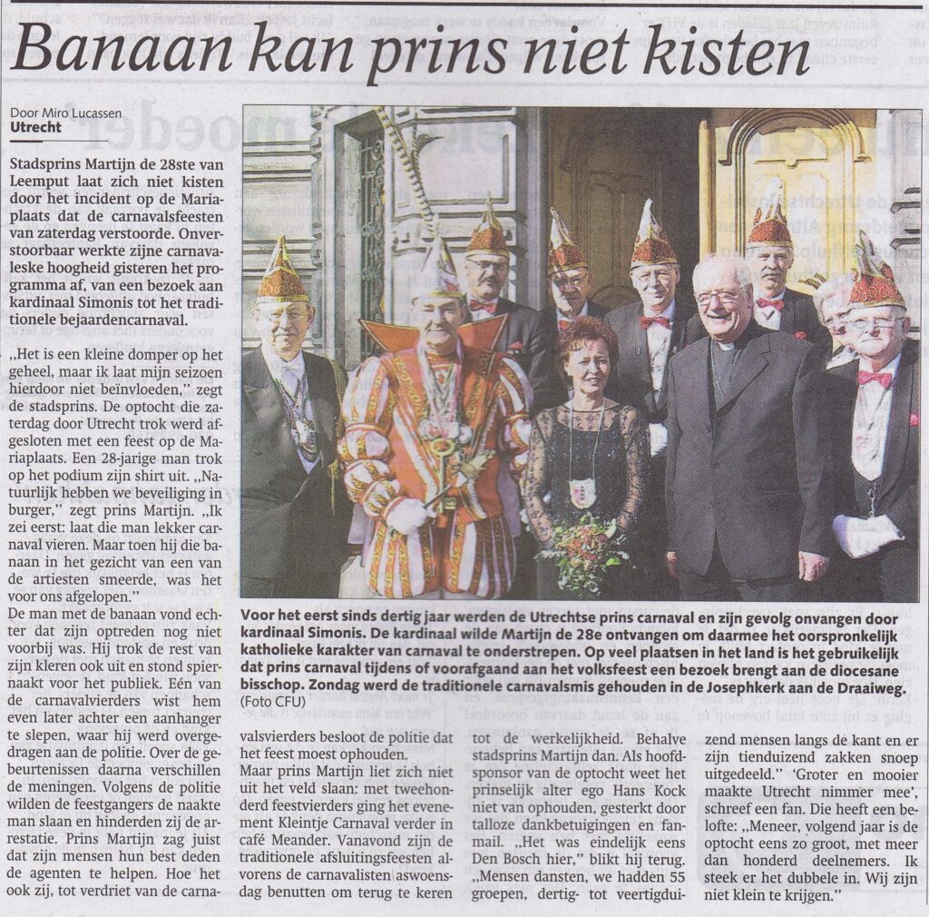 Voor het eerst sinds dertig jaar werden de Utrechtse prins carnaval en zijn gevolg ontvangen door kardinaal Simonis. De kardinaal wilde Martijn de XXVIIIe ontvangen om daarmee het oorspronkelijk katholieke karakter van carnaval te onderstrepen. Op veel plaatsen in het land is het gebruikelijk dat prins carnaval tijdens of voorafgaand aan het volksfeest een bezoek brengt aan de diocesane bisschop. Zondag werd de traditionele carnavalsmis gehouden in de Josephkerk aan de Draaiweg. (Foto CFU)