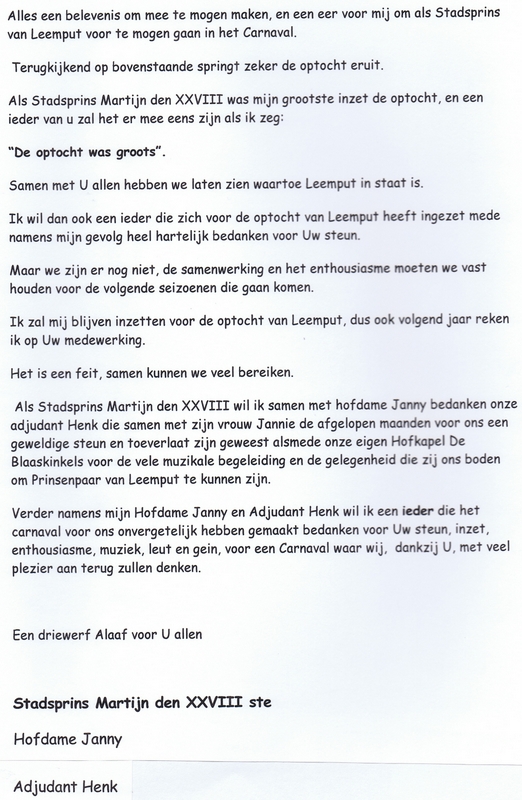 Als Stadsprins Martijn den XXVIII wil ik samen met hofdame Janny bedanken onze adjudant Henk, die samen met zijn vrouw Jannie de afgelopen maanden voor ons een geweldige steun en toeverlaat zijn geweest, alsmede onze eigen Hofkapel De Blaaskinkels voor de vele muzikale begeleiding en de gelegenheid die zij ons boden om Prinsenpaar van Leemput te kunnen zijn.
