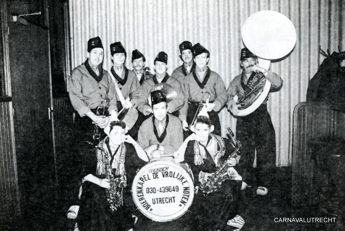 Wanneer Blaaskapel De Vrolijke Noten hun instrumenten oppakte, wist men in Utrecht precies hoe laat het was: het carnaval kon beginnen. Op deze foto staat de kapel trots bij elkaar, een hechte club muzikanten met één missie — sfeer maken. Trompetten, saxofoons, tuba en slagwerk vormden samen het herkenbare geluid dat menig carnavalsavond kleur gaf.